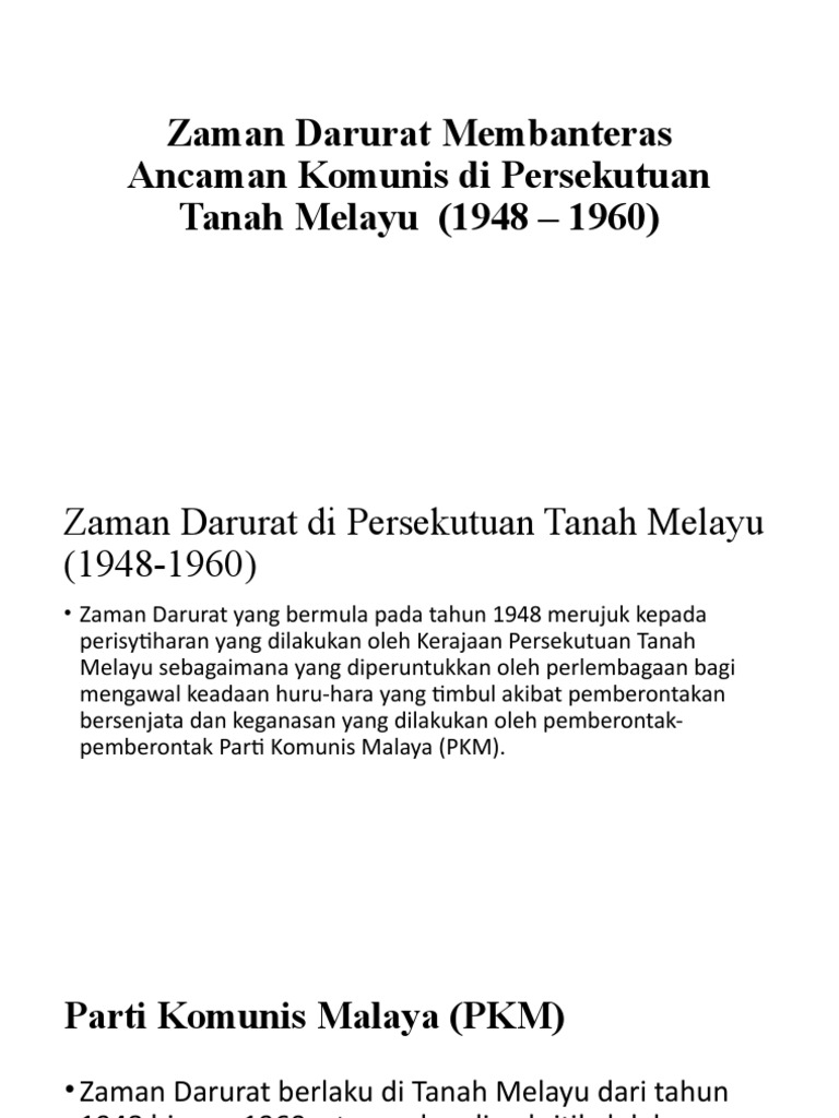 Bab 3 Ancaman Parti Kounis Malaya Dan Darurat Ppt Download from slideplayer.info Page ini hanya untuk suka2 , bkn bertujuan menyokong komunis ok. Komunis tidak mengakui kewujudan tuhan. Lagu barisan gerila malayaadalah lagu milisi partai komunis malaysia sebagai lagu penyemangat mereka selama. Walaupun prinsip utama komunisme yang ditulis oleh karl marx tidak mempercayai tuhan dan menyatakan bahawa agama itu adalah candu manusia, namun apa yang berlaku di tanah melayu pada waktu itu ialah mereka mengamalkan. Pertama, kelemahan pengaruh parti tindakan rakyat (peoples action party (pap)) dan kemunculan pemimpin berhaluan kiri dan sosialis di singapura. It was founded in 1930 and laid down its arms in 1989. Tubuhkan republik komunis malaya 1930 •pkm ditubuhkan 1935 •kegiatan pkm semakin agresif cuba bertapak di sarawak tetapi gagal 1935 : Namun, tindakan oleh tunku dengan membuat pengumumuan penubuhan persekutuan malaysia telah mengejutkan beberapa pihak.