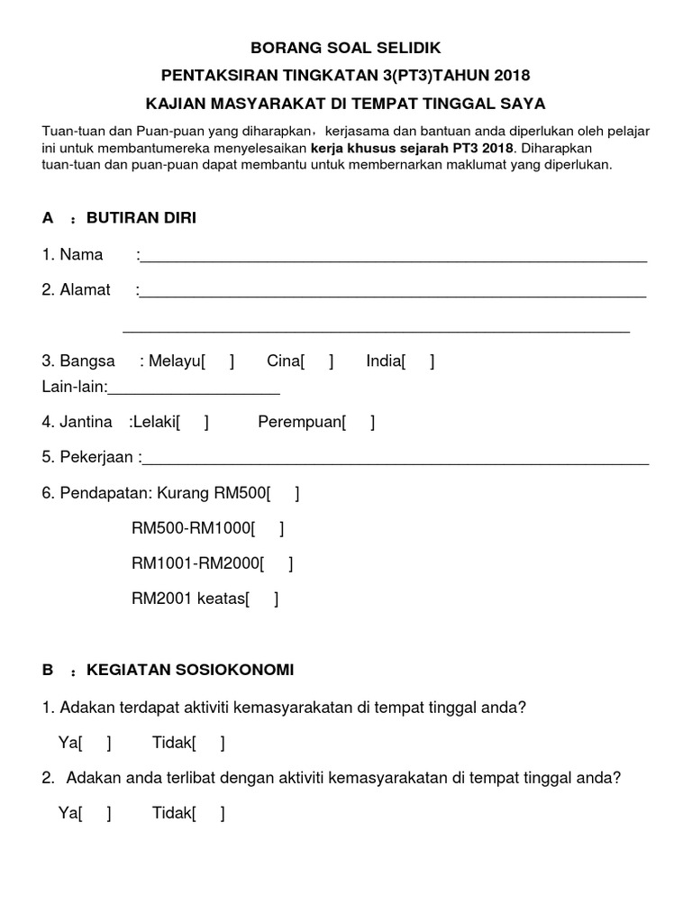 Soal Selidik Sejarah Pt3 - Borang soal selidik sistem pengangkutan pt3.. We are a sharing community. Pelajar tingkatan 3 perlu menyiapkan kerja kursus yang merupakan jenis pentaksiran pelbagai instrumen yang terdapat dalam peperiksaan pt3. Borang soal selidik sistem pengangkutan pt3. Tajuk kajian 'guna tanah di kawasan kajian anda' telah dipilih sebagai tugasan yang wajib disiapkan oleh setiap calon pt3 pada tahun 2018. Soal selidik itu perlu dilakukan oleh calon pt3 di tingkatan 3 secara individu mahupun secara berkumpulan bagi mendapatkan maklumat serta maklum balas daripada responden (individu yang disoal selidik) di kawasan kajian berhubung dengan tugasan.